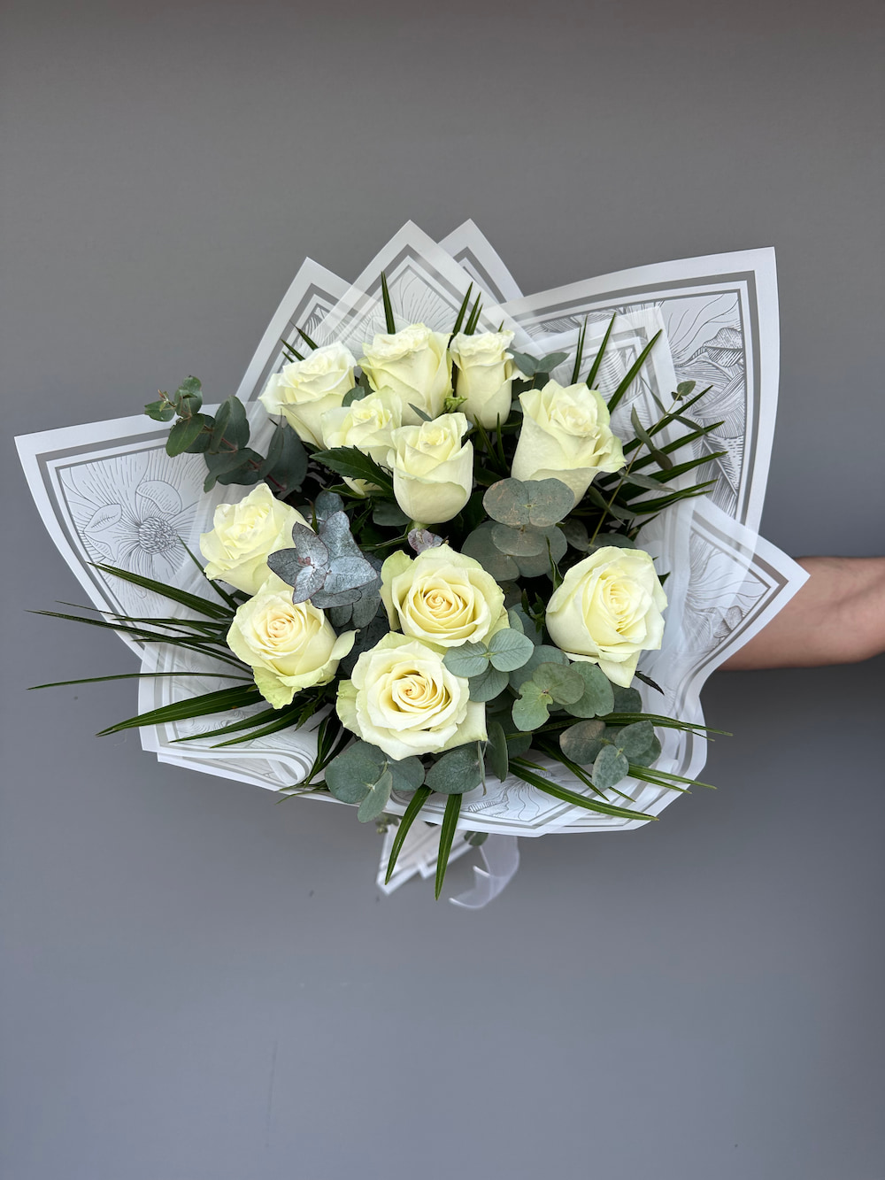 11 adet ithal gül okliptüs ve dekoratif kağıtlar kullanılarak hazırlanmıştır.