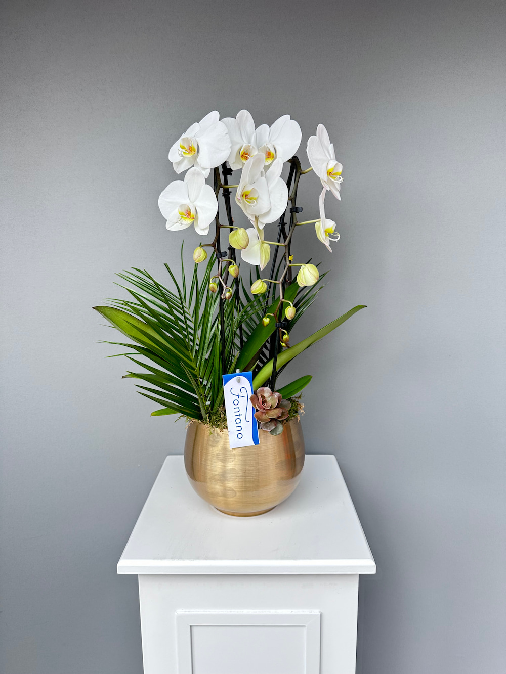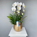 Fontana metal saksıda özel orkide Fontana olarak adlandırılan eğimli, beyaz bol ve büyük çiçekli orkide altın rengi metal dekoratif saksıda yer alıyor.